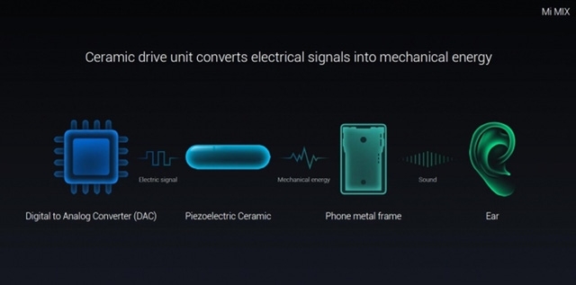 Trên Xiaomi Mi Mix bạn sẽ không tìm thấy loa thoại, vì vị trí đặt loa thoại là phần cạnh trên máy không tồn tại. Xiaomi cho biết họ đã sử dụng công nghệ gốm áp điện để truyền âm thanh qua toàn bộ phần vỏ gốm và khung kim loại của máy. Có nghĩa là bạn không chỉ nghe được ở phần trên đỉnh mà bạn áp tai vào bất cứ vị trí nào, dù mặt trước hay sau, cạnh trên hay dưới của Mi Mix, bạn đều có thể nghe được điện thoại.