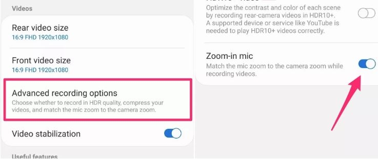 Đầu tiên, mở ứng dụng camera và nhấn vào thiết bị cài đặt >> Cuộn xuống và chọn Tùy chọn ghi nâng cao >> Chuyển đổi thanh trượt bên cạnh Phóng to Mic sang vị trí Bật. Qua đó, khi được bật bất cứ khi nào bạn quay video và phóng to một chủ đề, micrô của Note 10 sẽ khuếch đại mọi âm thanh phát ra từ khu vực bạn phóng to và nó sẽ hiển thị mức dộ thu phóng từ 1 đến 10, giúp bạn dễ dnagf điều chỉnh theo ý muốn.