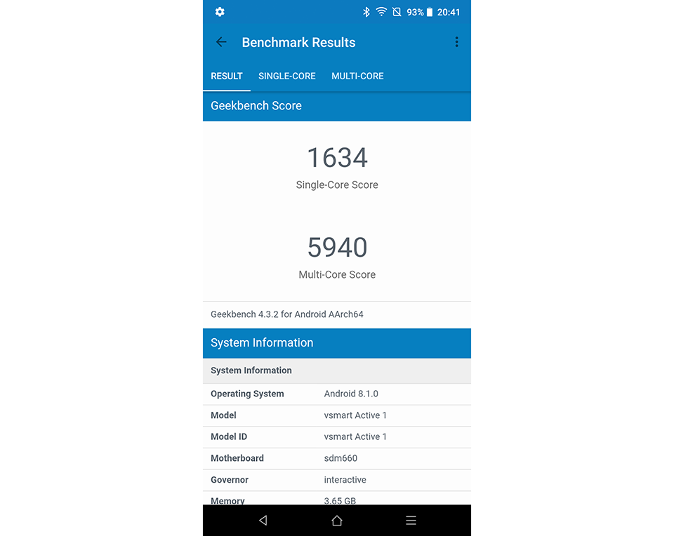 Điểm lại thông số cấu hình của máy, Vsmart Active 1 được trang bị con chip Snapdragon 660, 4GB RAM và 64GB bộ nhớ trong. Sở dĩ con chip SD660 được đánh giá rất cao ngay từ khi ra mắt là bởi khác với các thế hệ trước, con chip này không còn sử dụng nhân Cortex mà được dùng lõi Kryo 260 tùy biến giống như dòng 8xx cao cấp. Chính vì vậy hiệu năng CPU của con chip này rất cao.