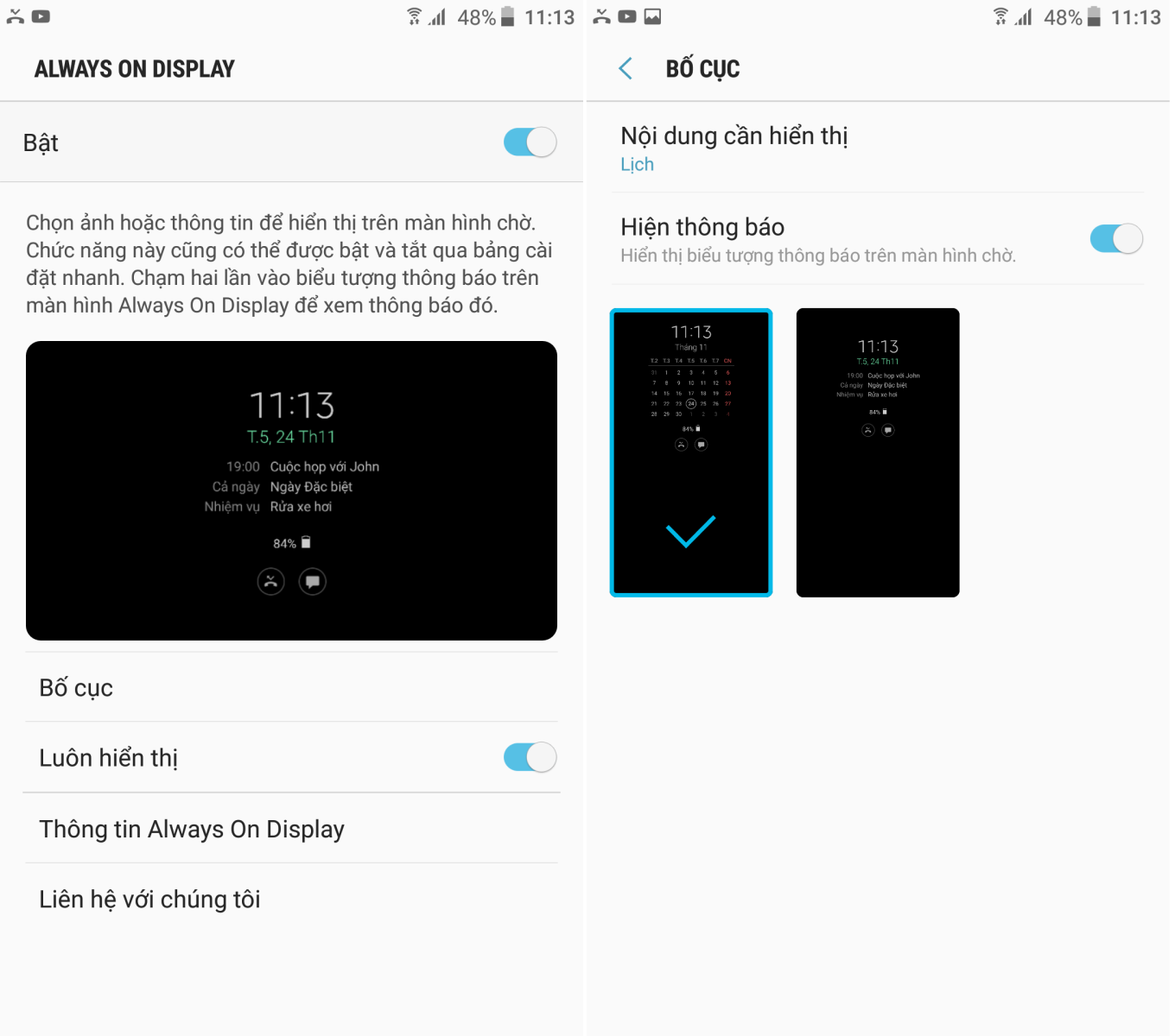 Giao diện về hiển thị đồng hồ, thông tin và những thay đổi tùy chọn về thiết lập thông báo dành cho người dùng đa dạng hơn. Thông tin về những thay đổi trên bản cập nhật cho thấy tính năng Always on Display sẽ cho phép tùy chọn hiển thị thêm một loại Calendar nữa, giúp người dùng sẽ có thêm lựa chọn yêu thích cho mình. Người dùng vẫn có thể đặt một bức ảnh yêu thích chữ ký cá nhân trên màn hình Always On Display với màu sắc và font chữ tùy chọn.