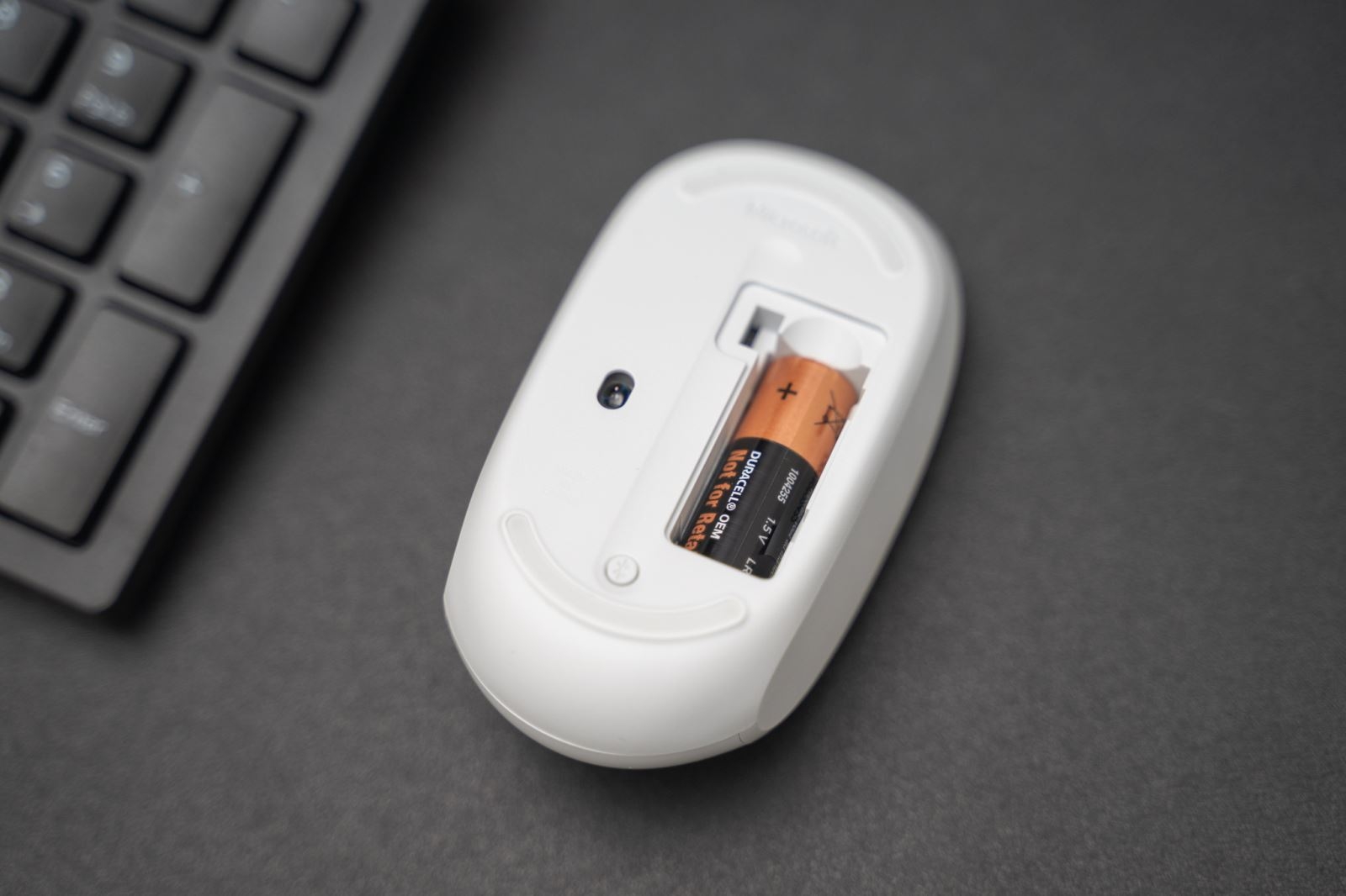 Đặc biệt, sau một thời gian trải nghiệm thì mình cảm thấy nút cuộn bằng nhựa rất êm, không phát ra tiếng khi sử dụng. Hai nút trái phải khi nhấn phát ra âm thanh khá vui tai, thích hợp cho những bạn thích nghe tiếng kêu phát ra từ chuột. Phía dưới của chuột là cảm biến quang học cũng như phần lắp pin. Microsoft Bluetooth Mouse sử dụng một viên pin AA với thời lượng lên đến 12 tháng.