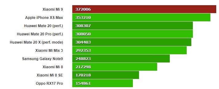 Điểm AnTuTu mà Xiaomi Mi 9 đạt được lên tới 372.006 điểm, cao hơn cả iPhone Xs Max. Trong số những smartphone dùng Snapdragon 855, Xiaomi Mi 9 cũng đứng ở vị trí hàng đầu. Có thể thấy là Xiaomi đã tối ưu phần cứng và phần mềm tốt đến thế nào.