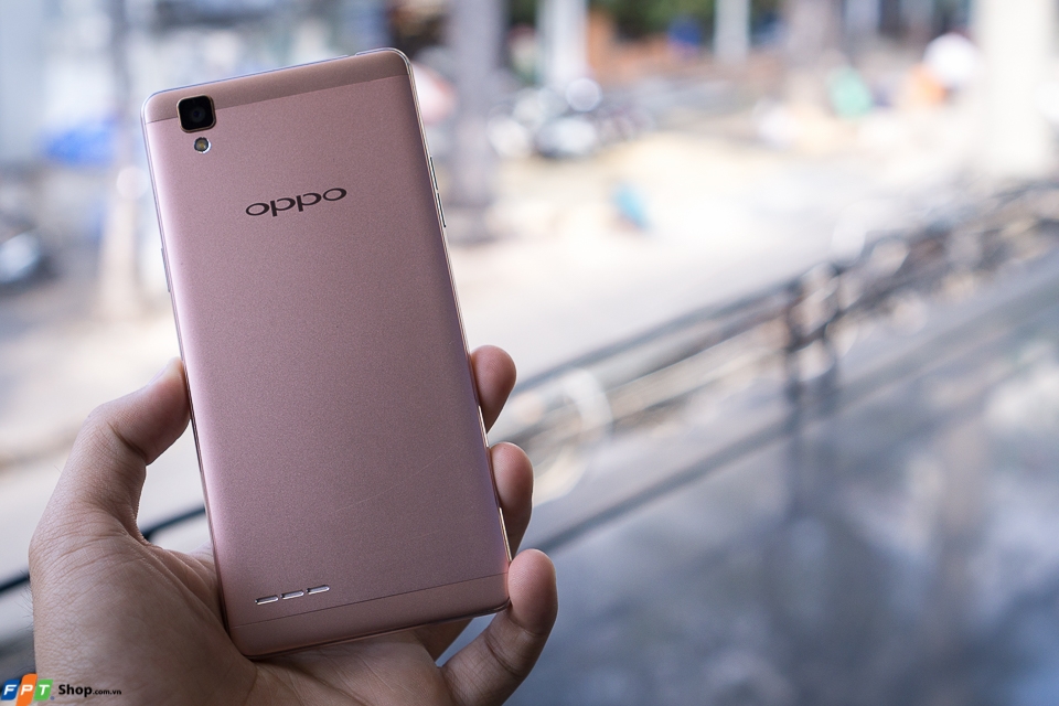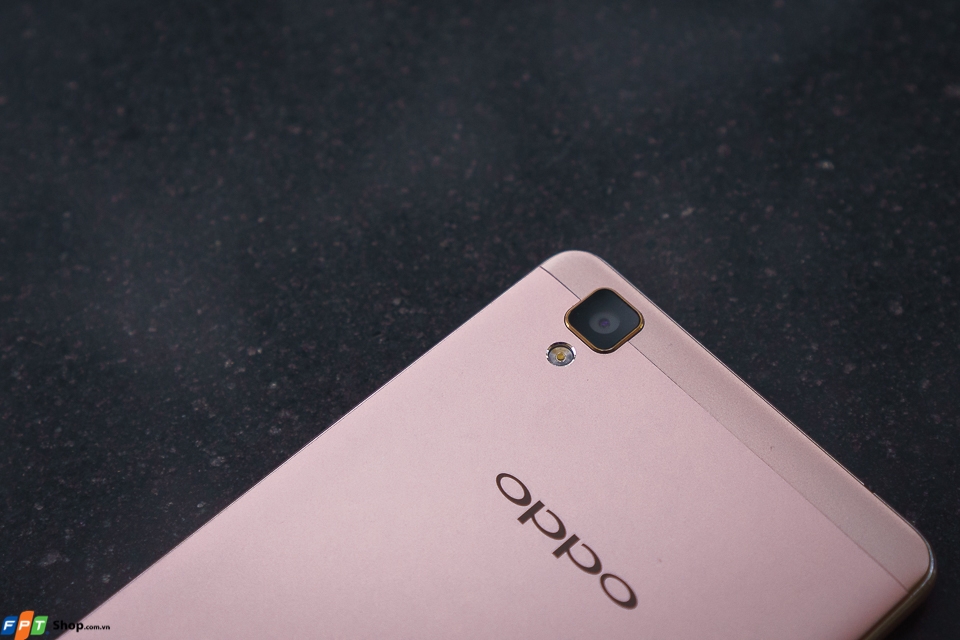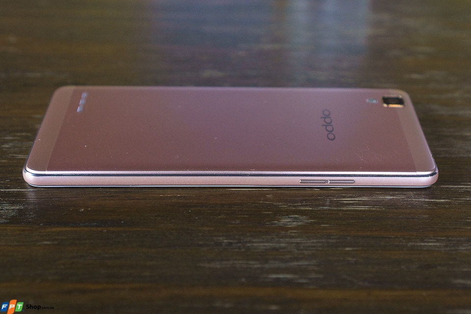 Mặt lưng của máy được phủ lên một lớp đặc biệt, ít bám mồ hôi, dấu vân tay, camera không bị lồi lên quá nhiều. Ở khu vực này thì OPPO F1 nhìn rất giống với R7 Lite, ngoại trừ phần loa ngoài nằm ở phía dưới. Cụ thể, loa ngoài của F1 là 3 lỗ loa lớn xếp thành một hàng ngang nằm cùng phía camera, thay vì các lỗ nhỏ tạo thành hình bầu dục và nằm bên ngược lại như trên R7 Lite.
