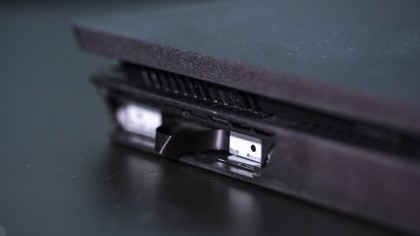 Để phát hiện ra ổ cứng của PS4 Pro, chỉ cần đặt hệ thống ngược lên trên một mặt phẳng và tìm tấm nhựa nhỏ ở phía sau. Sử dụng một nhãn nhỏ bên cạnh cổng Ethernet để bật bảng điều khiển.