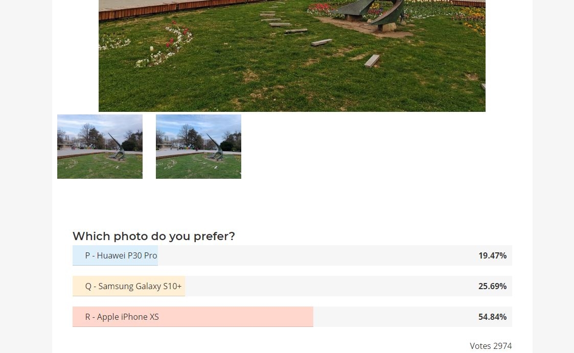 Chuyên trang công nghệ PhoneArena đã chứng minh điều nà khi dùng iPhone XS để so sánh với Huawei P30 Pro và Samsung Galaxy S10+. Họ đã chụp những bức ảnh giống nhau trên cả 3 smartphone, sau đó dấu tên thiết bị và yêu cầu độc giả lựa chọn bức ảnh mà họ cho là đẹp nhất. Kết quả rất đáng ngạc nhiên.