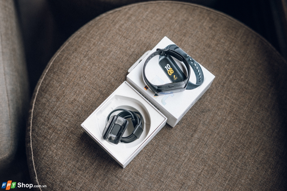 Đầu tiên là hộp Galaxy Fit, chúng vẫn là dáng vấp quen thuộc của các hộp smartwatch hiện nay nhà Samsung. Phụ kiện đi kèm theo của thiết bị là một dock sạc và không hỗ trợ thêm dây. Máy sẽ có 2 phiên bản màu Đen và Xám.