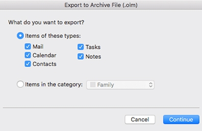 Bước 2: Lúc này, cửa sổ Export to Archive File (.olm) sẽ hiện ra trên giao diện. Trong danh sách được cung cấp, hãy chọn lần lượt các nội dung bạn muốn lưu trữ trong OLM và nhấn Continue.