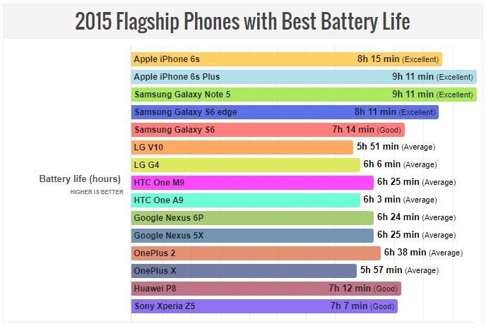 Đầu tiên chúng ta sẽ nhìn về thời điểm năm 2015. Hai cái tên có thời lượng pin tốt nhất không hề xa lạ là iPhone 6s Plus và Samsung Galaxy Note 5. Cả hai chiếc điện thoại này đều có thời lượng pin sử dụng liên tục là 9h11 phút. Tuy nhiên hầu hết các “ông lớn” khác đều chỉ có pin từ 6 – 7 tiếng. Thời lượng pin trung bình mà Phone Arena đo được trên các smartphone 2015 là 7 giờ 5 phút. Nghĩa là máy có thể sáng màn hình sử dụng liên tục tác vụ hỗn hợp trong thời gian này.