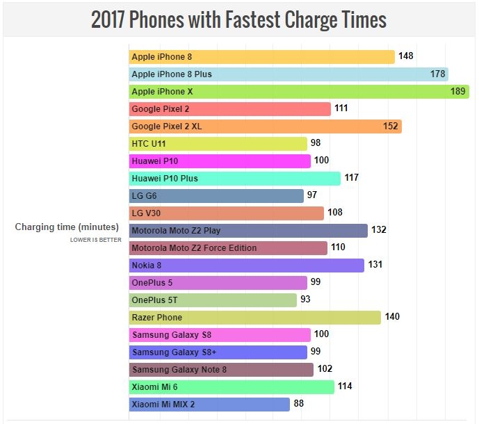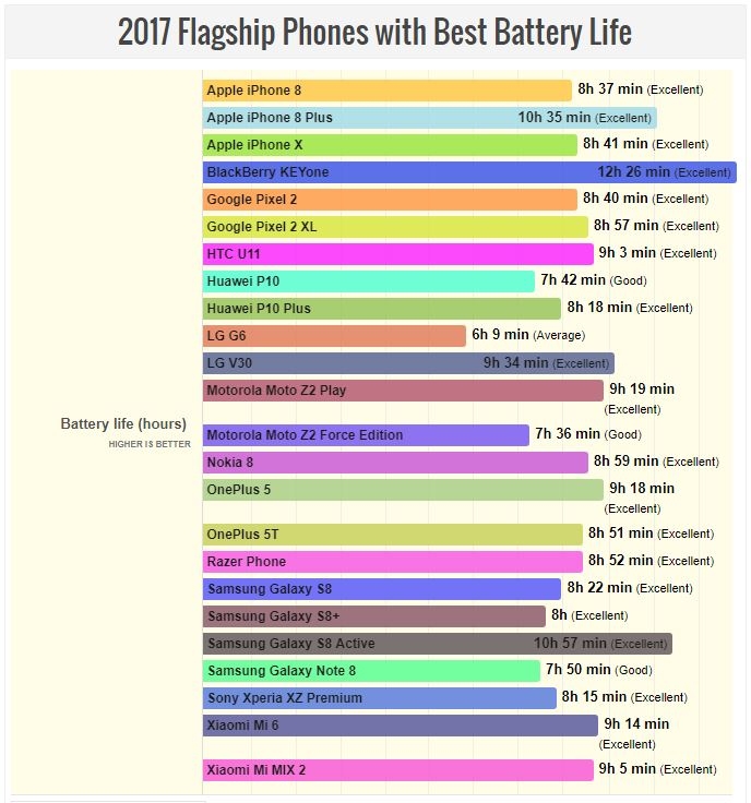 Năm 2017 vừa qua là năm mà các smartphone đã có bước tiến vượt bậc về thời lượng pin, đặc biệt là những flagship. BlackBerry KEYone gây bất ngờ khi sử dụng liên tục được trong 12 giờ 26 phút. Mặc dù chiếc iPhone X chỉ có thời lượng pin tương đương với iPhone 8 là 8 giờ 41 phút nhưng Apple iPhone 8 Plus vẫn thể hiện được mình với thời lượng pin xuất sắc 10 giờ 35 phút. Những smartphone cao cấp khác đều cũng có thời lượng pin khoảng 8 – 9 giờ. Thậm chí một hãng điện thoại vốn thường bị chê pin yếu như HTC cũng có chuyển mình rõ rệt khi HTC U11 đạt được con số 9 giờ 3 phút. Cuối cùng, thời lượng pin trung bình smartphone năm 2017 là con số khó tin 8 giờ 53 phút.