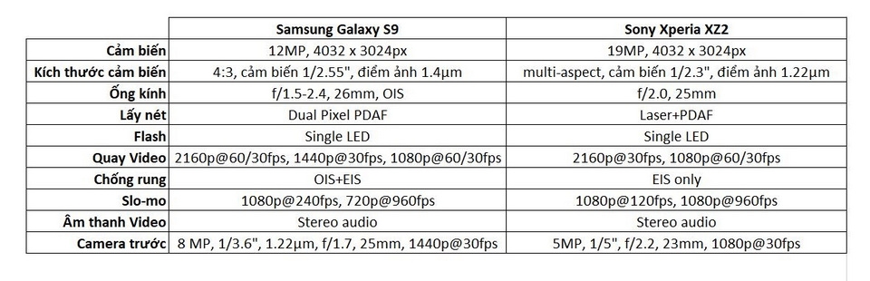 Samsung vẫn trung thành với cảm biến 12MP DualPixel của họ, dù không thay đổi về độ phân giải nhưng Galaxy S9 lại có lợi thế lớn về khẩu độ và chống rung (OIS + EIS). Trong khi đó Xperia XZ2 lại sở hữu cảm biến lớn cả về kích thước lẫn độ phân giải. Sự khác biệt về thông số phần cứng cụ thể hai máy bạn có thể theo dõi ở bảng dưới đây: