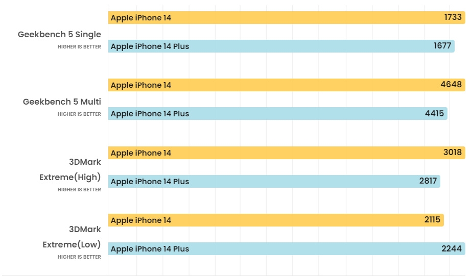Theo thử nghiệm của hai trang Tom’s Guide và PhoneArena, iPhone 14 và iPhone 14 Plus đạt điểm hiệu năng xử lý rất giống nhau. Tuy nhiên theo đánh giá iPhone 14 Plus, model này có lợi thế ở một số khía cạnh do khả năng làm mát tốt hơn nhờ thân máy lớn hơn.