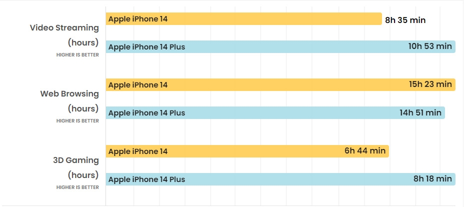 Còn theo thử nghiệm của Tom’s Guide, thời lượng pin trung bình của iPhone 14 là 9 giờ 28 phút (duyệt Internet liên tục qua 5G). Model iPhone 14 Plus là 11 giờ 57 phút. Còn với thử nghiệm của trang PhoneArena thì iPhone 14 cho thời gian lướt web nhỉnh hơn so với iPhone 14 Plus với 15 giờ 23 phút so với 14 giờ 51 phút.Bù lại thời gian chơi game và xem video của iPhone 14 Plus đều lâu hơn đáng kể so với iPhone 14.