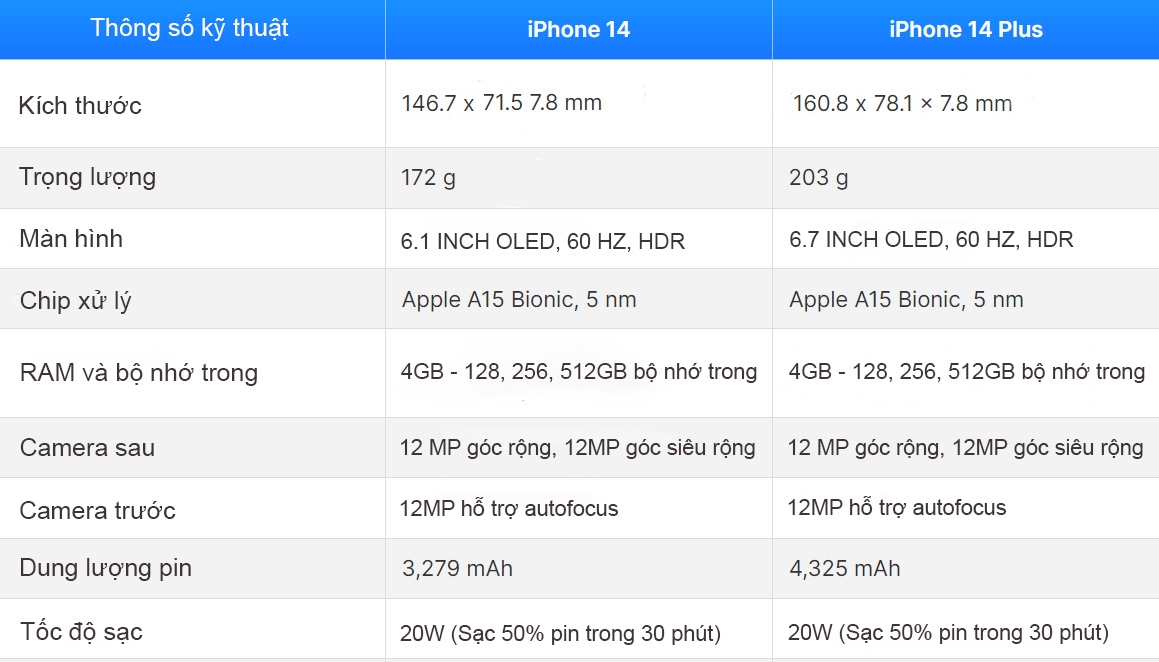 Bảng cấu hình của iPhone 14 và iPhone 14 Plus
