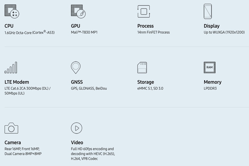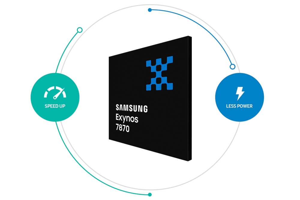 Về kỹ thuật, Exynos 7870 gồm có 8 nhân Cortex-A53, xung nhịp tối đa 1.6Ghz, được sản xuất theo tiến trình 14nm hiện đại. So với các chip 28 nm trước đây, hiệu suất đã được tăng lên đáng kể và mức tiêu thụ điện năng cũng thấp hơn 30%. Modem LZE Cat.6 tích hợp cho tốc độ truyền lên đến 300 Mbps (tải xuống) và 50 Mbps (tải lên). Bộ nhớ RAM hỗ trợ kênh đôi RAM LPDDR3-1866.