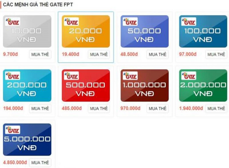 Thẻ sẽ có nhiều mệnh giá khác nhau để phù hợp với nhu cầu của người tiêu dùng. Các mức giá trải dài từ 10.000 đồng, 20.000 đồng,100.000 đồng cho đến 5.000.000 đồng. Người mua có thể mua thẻ truyền thống dưới dạng thẻ cào giấy hoặc thẻ điện tử được cung cấp qua các nhà cung ứng trung gian. Trong thời buổi công nghệ hiện đại ngày nay, thẻ điện tử được ưa chuộng về độ tiện lợi và thân thiện với môi trường.