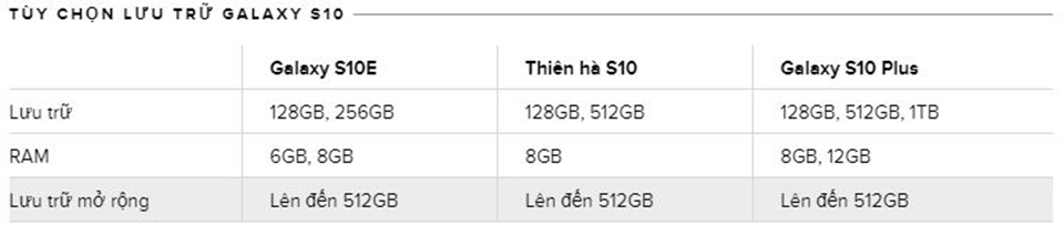 Bộ nhớ lưu trữ là một trong những điều bạn có thể không thật sự bận tâm nhiều cho đến khi bộ nhớ sắp hết. Nhưng so với các điện thoại như iPhone XS và Pixel 3, các tùy chọn bộ nhớ mặc định của Galaxy S10 của Samsung tỏ ra rất hào phóng. S10e bắt đầu với bộ nhớ 128GB và có khe cắm thẻ nhớ microSD để cung cấp cho bạn dung lượng lưu trữ lên tới 512GB. Đối với những người có nhu cầu cao về quay phim, chụp ảnh thì Galaxy S10+ có thể giúp bạn có được dung lượng lưu trữ lên tới 1TB (với 12GB RAM) hoặc 1,5TB với thẻ nhớ microSD mở rộng.