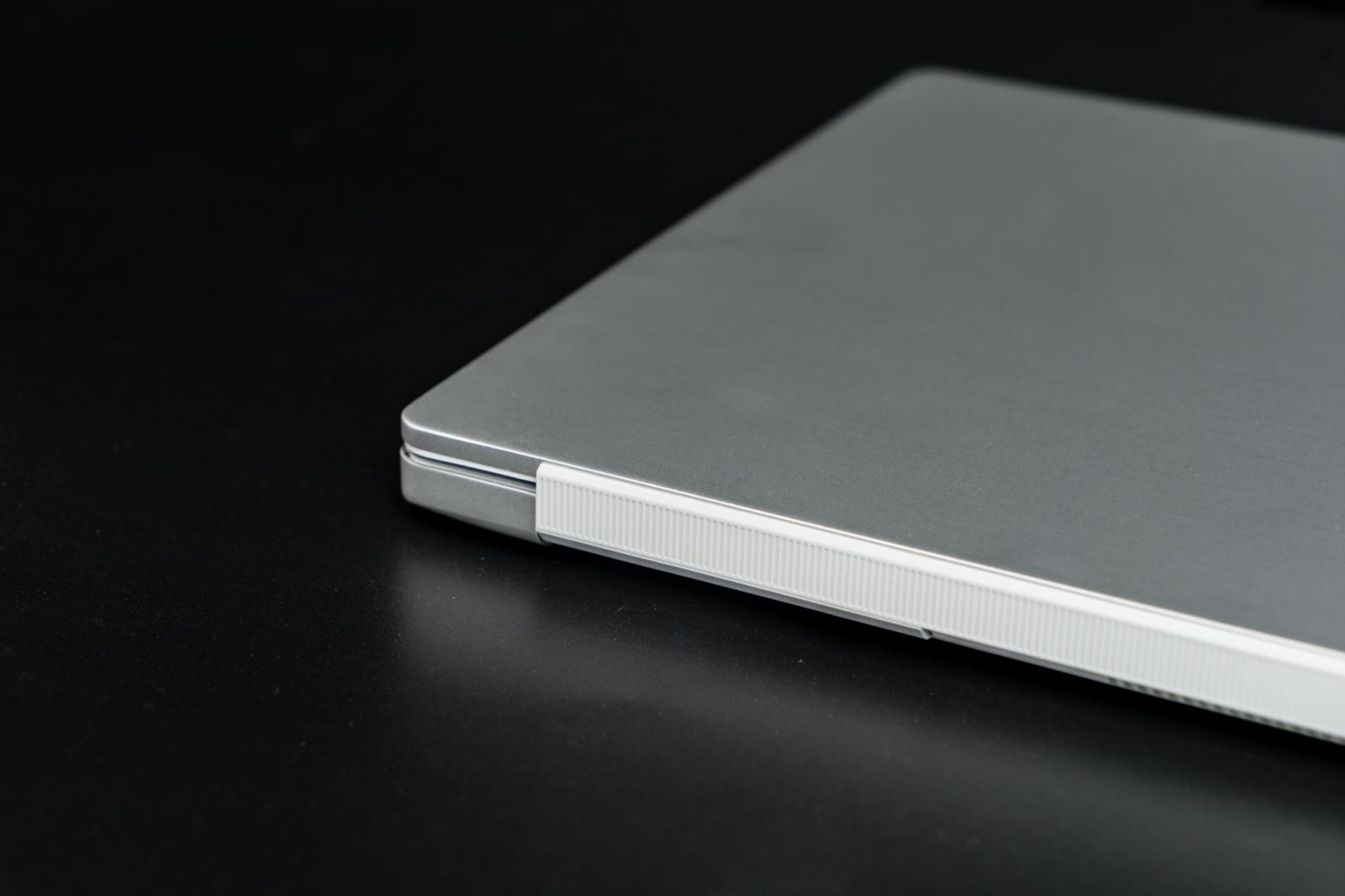 Các đường viền bezel cũng cực kì mỏng, chúng bao bọc quanh thân máy một cách liền mạch. Bộ khung của máy góp phần làm cho thiết kế tổng thể trông như một chiếc laptop 14 inch mặc dù kích cỡ màn hình thực sự to hơn thế. Với một cỗ máy thường xuyên đồng hành bên bạn mỗi ngày như vậy thì kích cỡ này chấp nhận được.
