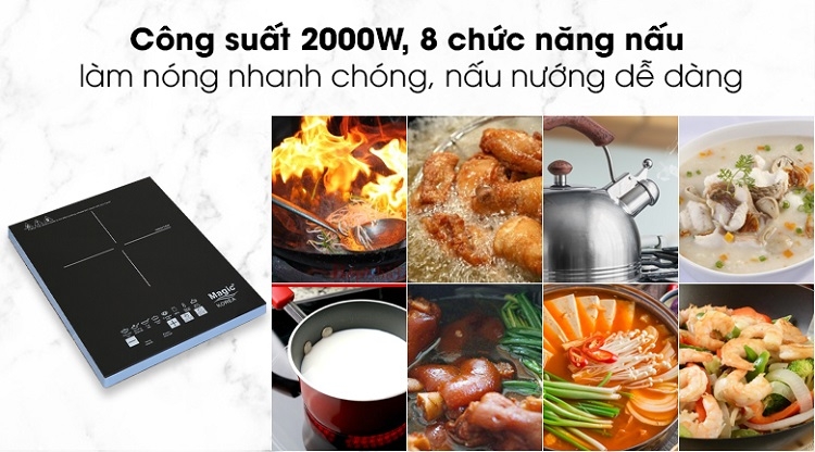 Bếp từ Magic sẽ trở thành trợ thủ đắc lực của chị em khi vào bếp với tám chế độ nấu cơ bản. Bạn có thể sử dụng các chức năng như: Chiên, hấp, xào, nấu, giữ ấm, nấu súp,... Trên cùng một thiết bị điện gia dụng.