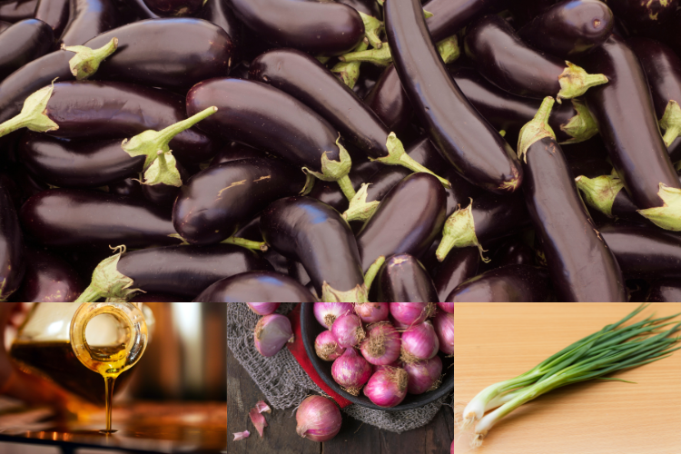 Bước 3: Trong lúc chờ đợi cà tím chín, bạn tiến hành phi mỡ hành bằng cách cho một ít dầu ăn vào chảo và đun nóng. Tiếp theo cho phần hành lá, hành tím thái nhỏ, một ít gia vị vào, đảo đều cho đến khi dậy mùi.