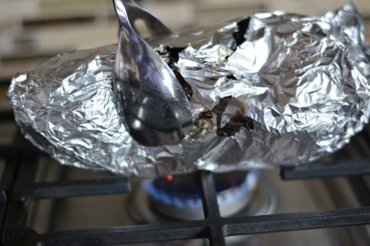 Bước 2: Đặt cà tím vào một miếng giấy bạc vừa đủ lớn, sau đó bọc kín các mặt lại và đặt lên vỉ nướng. Bạn bật bếp gas ở mức nhiệt vừa nhỏ, sau đó đặt vỉ nướng cà trên bếp gas và trở đều các mặt mỗi 5 phút.
