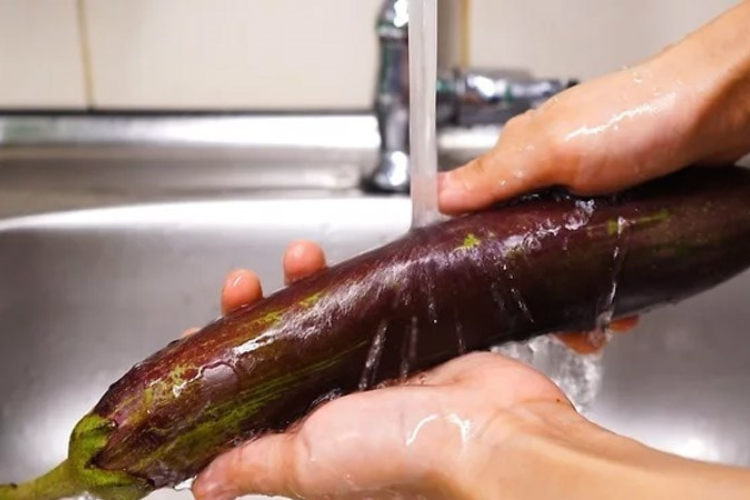 Bước 1: Bạn rửa sạch cà tím dưới nước lạnh, sau đó lấy dao rạch vài đường vào phần thân để cà chín đều khi nướng.