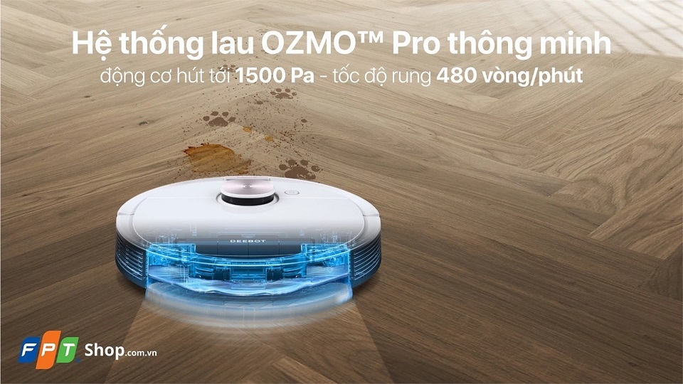 Công nghệ lau rung OZMO Pro có thêm điểm cộng khi sở hữu tốc độ rung 480 vòng/phút. Mọi vết bẩn dù là cứng đầu nhất cũng sẽ dễ dàng bị đánh bật bởi hệ thống rung mạnh mẽ này. Bạn có thể tìm thấy công nghệ này trên các dòng sản phẩm như: Ecovacs Deebot Ozmo T8 Max Plus, Ecovacs Deebot Ozmo T8 Max,...
