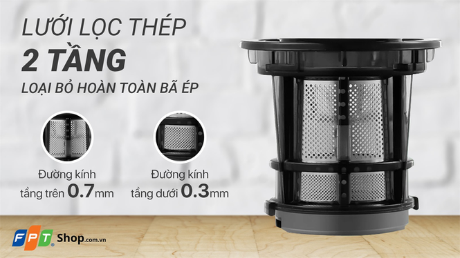 Tốc độ vòng xoay của máy chỉ 70-85 vòng/phút, đảm bảo dòng nước ép tươi sánh mịn, thơm ngon, giữ lại các khoáng chất, vitamin, enzym gấp 6 lần. Đồng thời, kết hợp với 2 tầng lọc riêng biệt với lỗ lọc siêu nhỏ tầng trên là 0.7mm và tầng dưới là 0.3mm, mang tới khả năng lọc 2 lần, cho nước ép thêm tinh khiết hơn khi loại bỏ tối ưu bã trái cây.