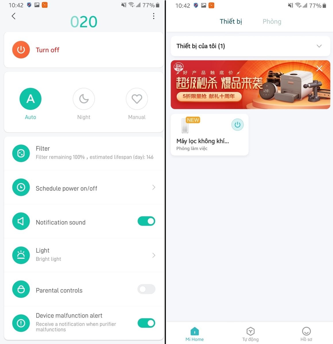 Trong Mi Home, bạn có thể chọn 3 chế độ sử dụng là Auto – Night – Manual cho máy lọc này. Độ mạnh của các cấp độ lọc sẽ tăng dần từ trái qua phải, với Auto máy sẽ chạy êm và cực nhẹ trong khi Night không hề phát ra tiếng ồn rồi cuối cùng Manual sẽ đẩy công suất của máy lên mức cao nhất. Tùy vào nhu cầu lọc nhiều hay ít, bạn có thể tự chọn chế độ phù hợp.