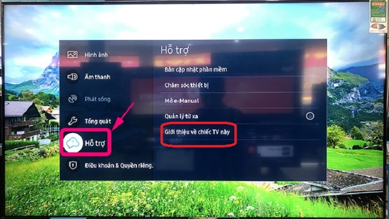 Bước 2: Di chuyển xuống dưới và chọn Hỗ trợ sau đó chọn mục Giới thiệu về chiếc TV này.