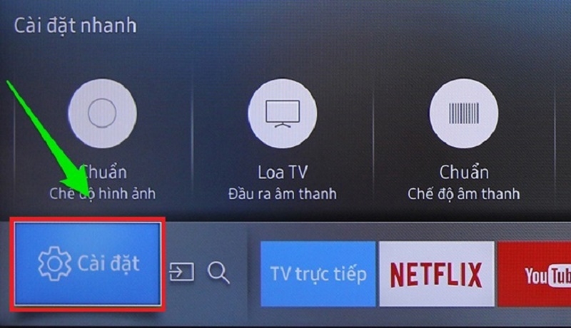 Bước 1: Bấm vào nút HOME trên điều khiển remote, sau đó lựa chọn Setting/Cài đặt có biểu tượng bánh xe trên màn hình tivi.