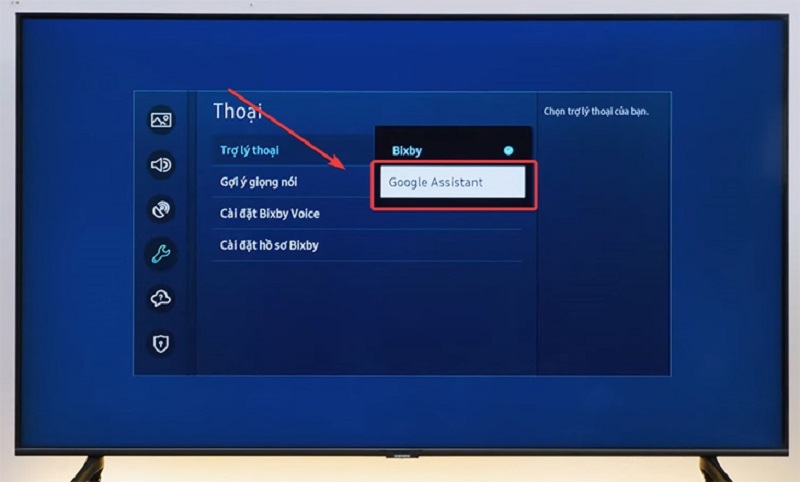 Bước 3: Sau đó, bạn di chuyển sang bên phải chọn Voice/ Thoại -> chọn Voice Assistant/ Trợ lý thoại. Đối với tivi mới mua trợ lý thoại sẽ hiển thị là “bixby”. Chế độ này sẽ hỗ trợ bạn điều khiển giọng nói bằng tiếng Anh. Để điều khiển bằng tiếng Việt, bạn chuyển trợ lý thoại sang Google Assistant.