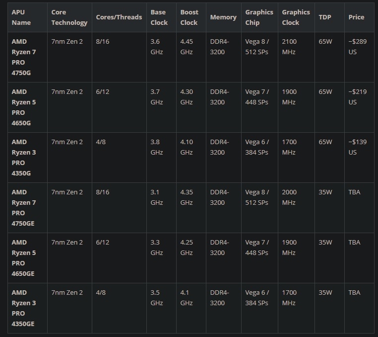 - Ryzen 3 PRO 4350G/GE APU: Sản phẩm entry-level trong dòng AMD Ryzen 4000 Renoir sắp tới sẽ có tốc độ 3.8GHz cơ bản và khi boost sẽ là 4.1GHz. Biến thể 35W của nó sẽ có tốc độ 3.5GHz cơ bản và 4.1GHz khi boost.