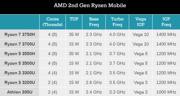 Xuống dưới một chút nữa thì ta có Ryzen 5 3550H và 3500U. Cả hai mẫu này đều là CPU quad-core với 8 luồng xử lí, tần số cơ bản 2.1GHz và tần số boost là 3.7GHz, 8 unit Vega, tần số tối đa của GPU là 1200MHz, hỗ trợ đến 4 màn hình hiển thị.