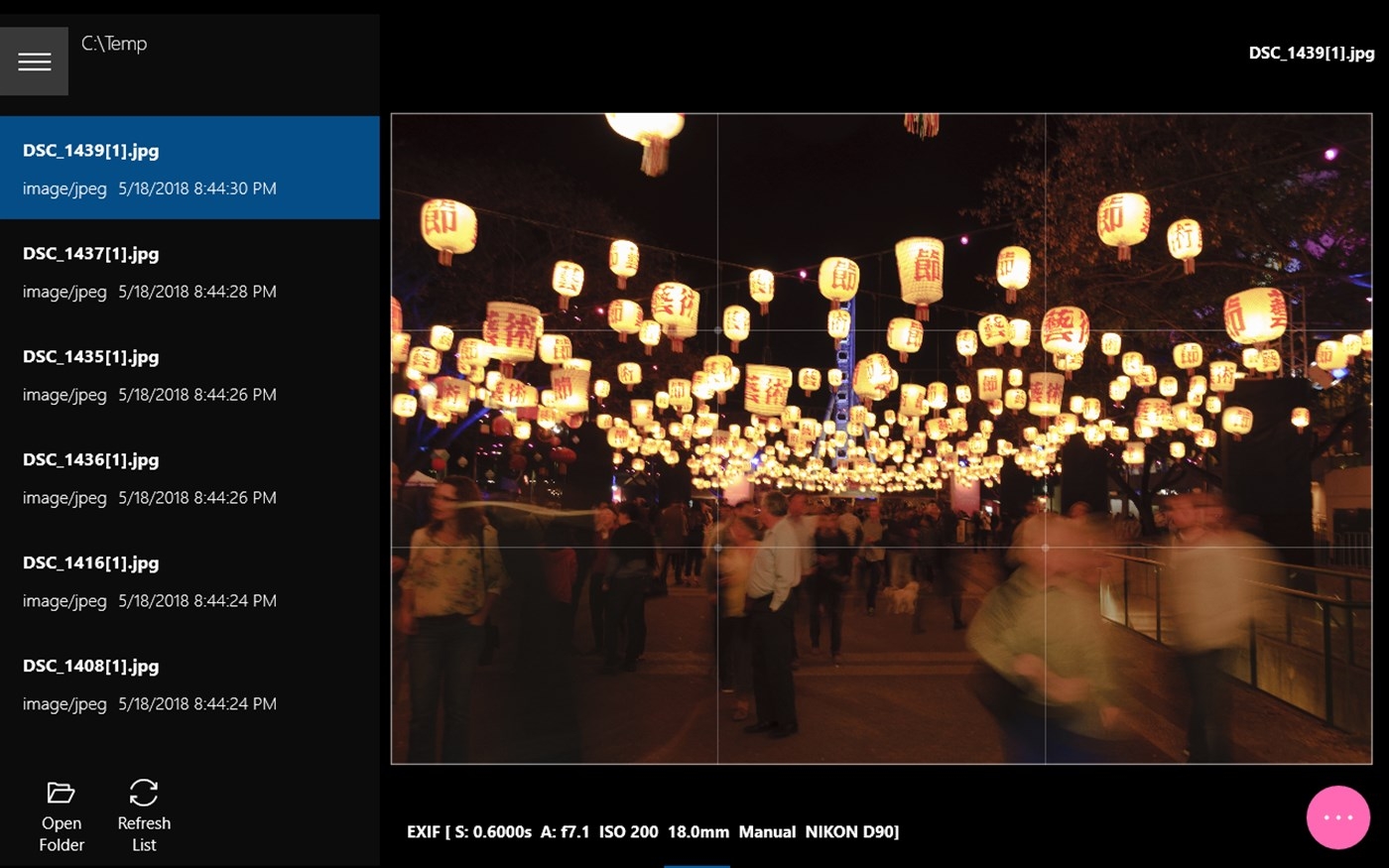 Mở ứng dụng, bạn sẽ nhìn thấy tên file ảnh trong thư mục Pictures. Nếu muốn chọn ảnh trong thư mục khác, bấm Open Folder. Sau đó, bạn chỉ cần bấm vào tên ảnh để xem. Trong giao diện xem, bạn có thể nhìn thấy thông siêu dữ liệu (EXIF) bên trong ảnh hoặc xem độ phơi sáng bằng biểu đồ RGB, kiểm tra thành phần màu sắc trên ảnh với lứi quy tắc 1/3, tùy chọn decoder ảnh.