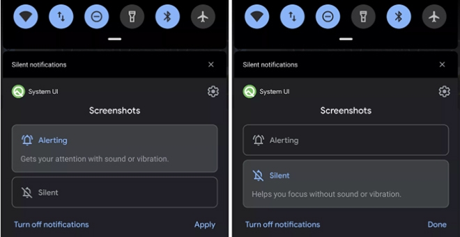 Đối với tính năng này, bạn có thể tắt âm báo ứng dụng bằng cách chọn nhấn, giữ cảnh báo đến khi chúng đưa ra lời nhắc là bạn có để âm thông báo (Alert) hay chọn im lặng (Silent). Chọn Alert, điện thoại sẽ cho phép các thông báo ứng dụng phát ra âm thanh, hiển thị trên màn hình khóa. Trong khi đó, bạn chọn Silent thì sẽ không có tiếng thông báo, nhưng vẫn hiển thị trên thanh thông báo.