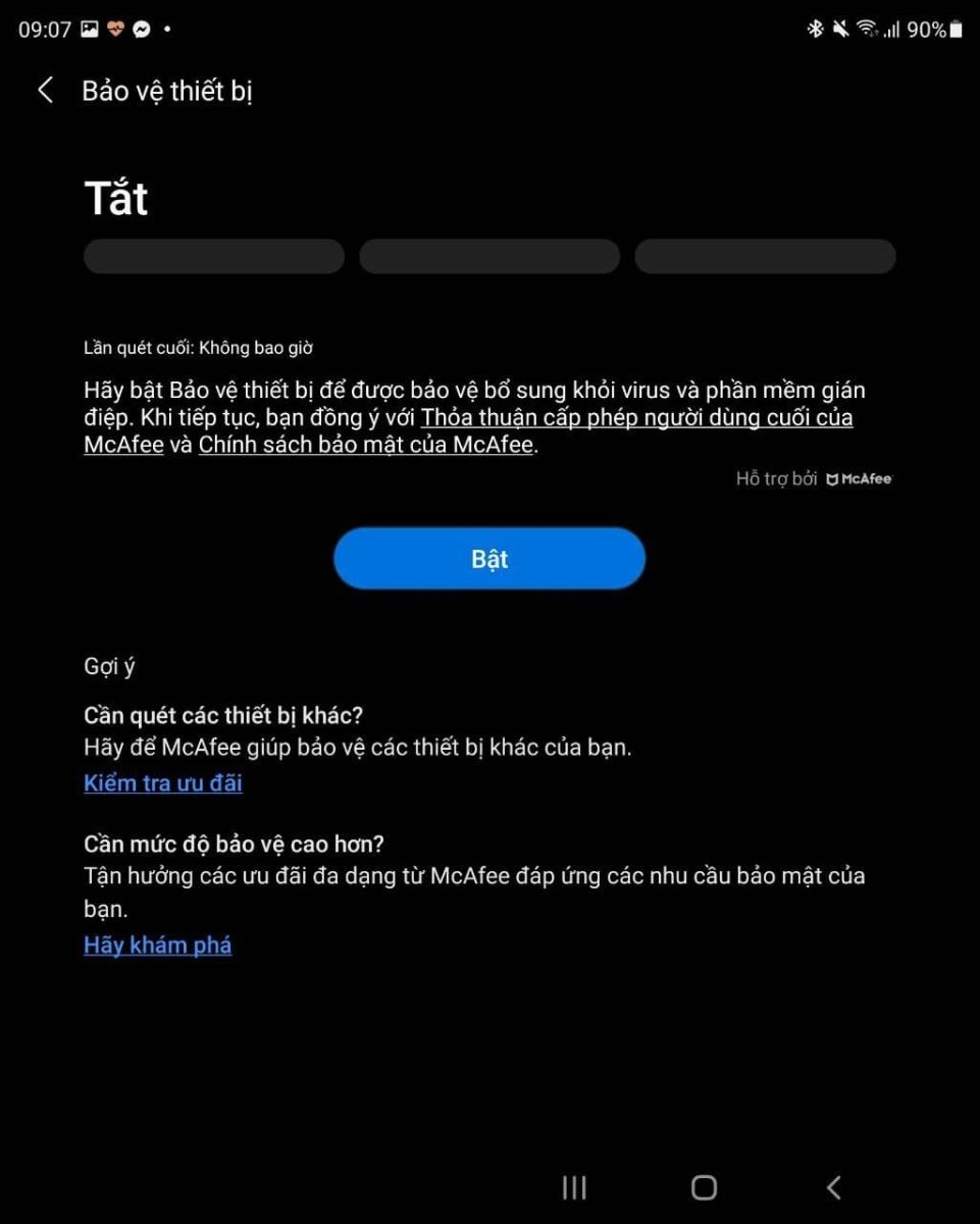 Để bật tính năng bảo vệ thiết bị, bạn hãy bấm vào mục Bật Bảo vệ thiết bị. Tính năng này sẽ mở trình bảo vệ virus McAfee trên thiết bị.