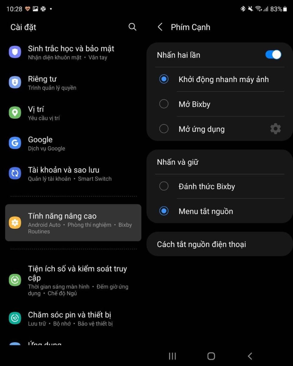 Đây cũng là một thủ thuật mà mình muốn ghi chú đến các bạn dùng các điện thoại khác quen rồi khi sử dụng Z Fold3 hay Z Flip3 sẽ hơi lạ, đó là thao tác nhấn và giữ nút nguồn trên điện thoại sẽ kích hoạt Bixby chứ không hiển thị menu tắt nguồn. Thao tác này cũng khá tiện khi bạn thường xuyên dùng Bixby, tuy nhiên nếu bạn muốn đem menu tắt nguồn quay trở lại thì máy cũng có hỗ trợ bạn, bạn hãy vào Cài đặt > Tính năng nâng cao > Phím Cạnh > phía dưới mục Nhấn và Giữ, bạn chọn Menu tắt nguồn.