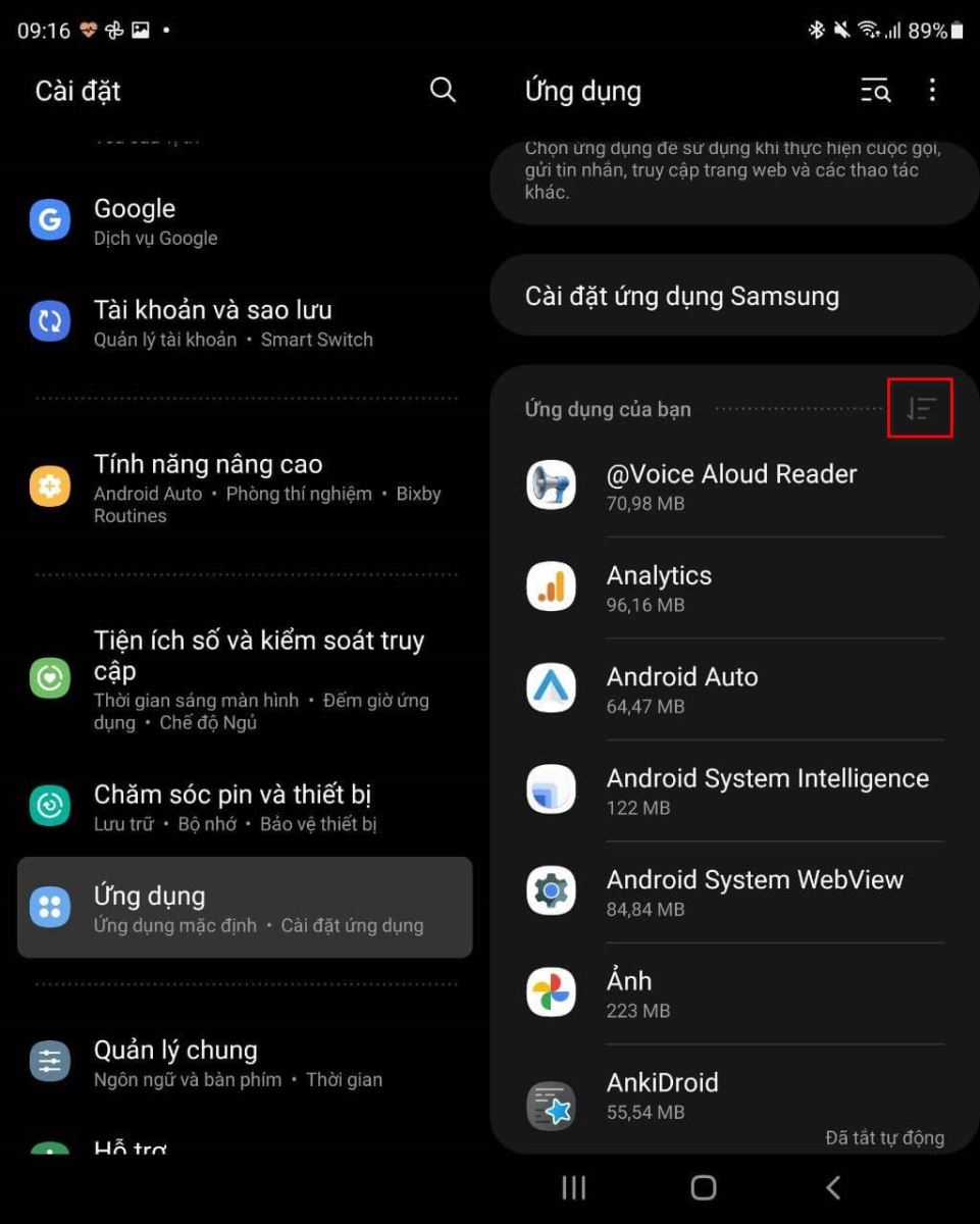 Bước 1: Vào Cài đặt > Ứng dụng > Bấm vào biểu tượng sắp xếp (đánh dấu màu đỏ).