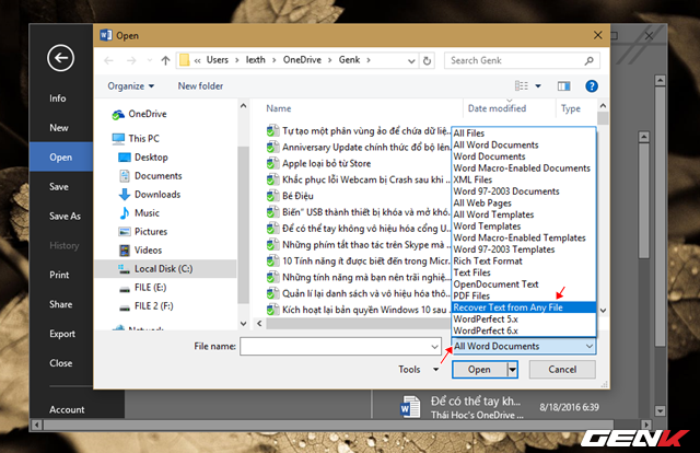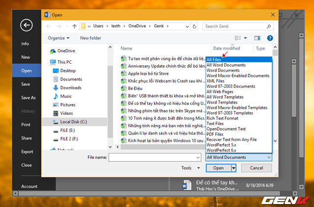 Ở cách này, chúng ta tiếp tục sử dụng tính năng tự động sao lưu của Office. Cụ thể bạn làm như sau: mở ứng dụng Word lên -> vào File -> Open -> tìm đến thư mục đã lưu tập tin Word trước đó -> nhấn vào tùy chọn “All Word Documents” -> chọn “All Files”.