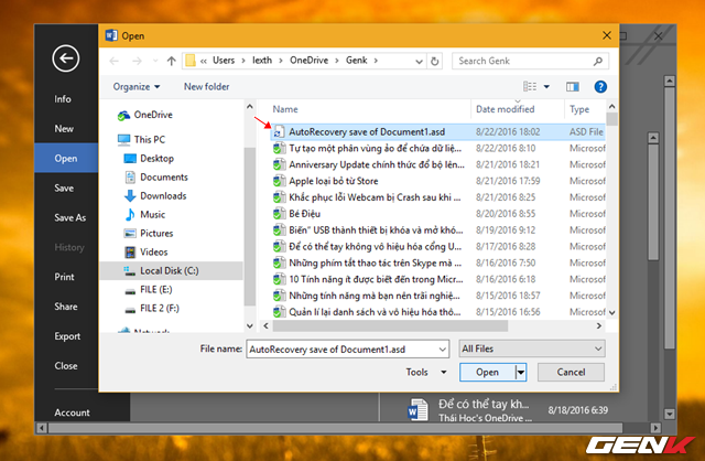 Khi đó, bạn cần tìm trong danh sách tập tin mới xuất hiện một tập tin tên bắt đầu là “AutoRecovery save of…”, đây chính là tập tin sao lưu tự động của file Word mà bạn đã soạn. Bây giờ bạn hãy chọn file này và nhấn Open để ứng dụng Word tiến hành khôi phục lại tập tin Word bị lỗi của bạn.