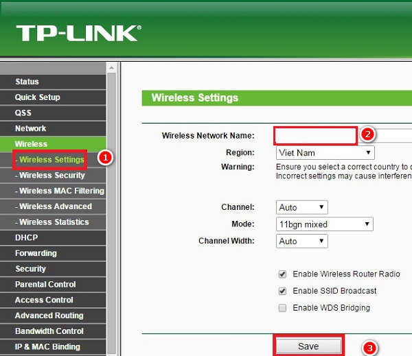 Quan sát thanh bên tay trái giao diện cài đặt, bạn chọn phần Wireless, chọn Wireless Setting. Đặt tên cho WiFi tại Wireless Network Name, chọn ngôn ngữ Việt Nam ở Region.