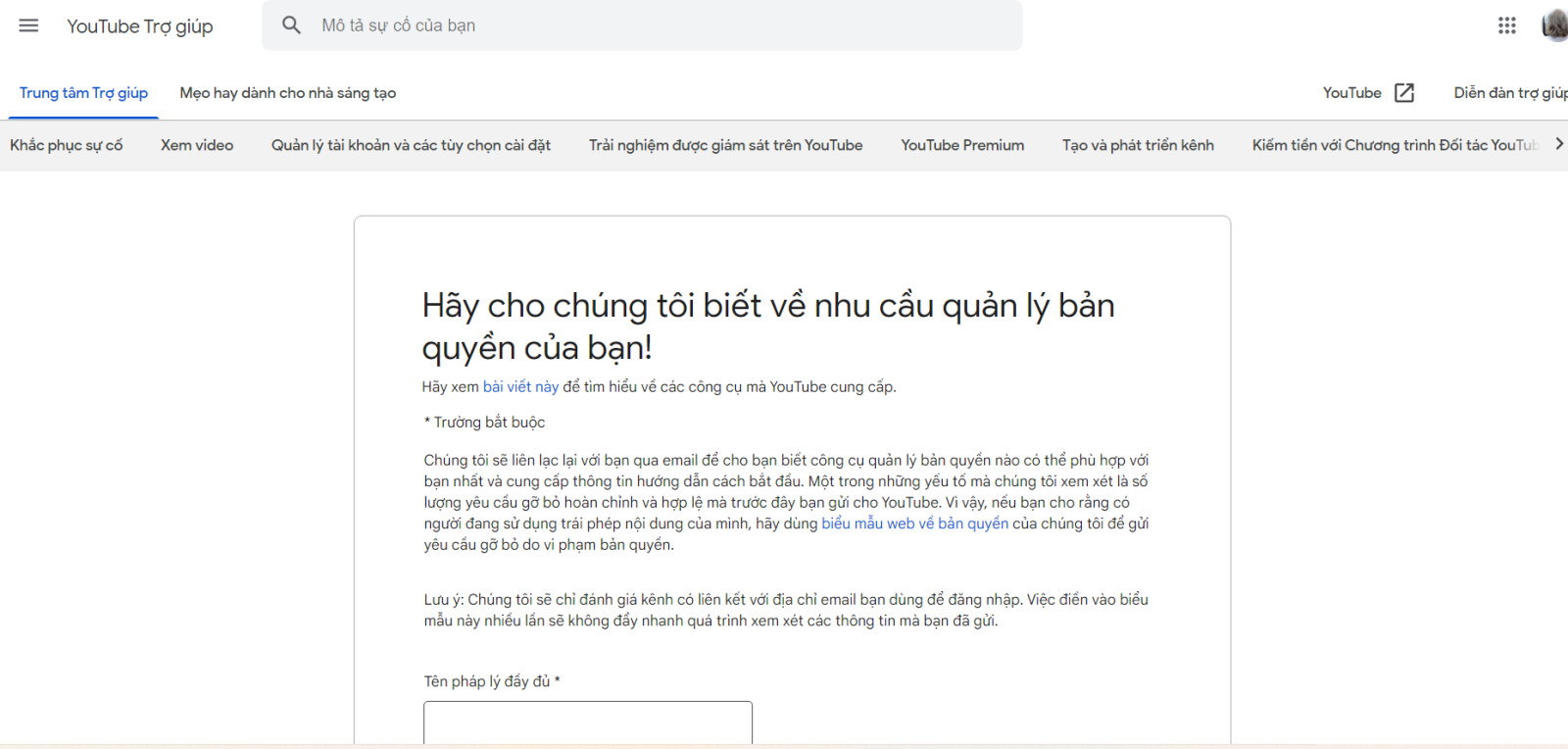 Bước 1: Truy cập vào trang YouTube Trợ giúp để thực hiện đăng ký bản quyền YouTube.