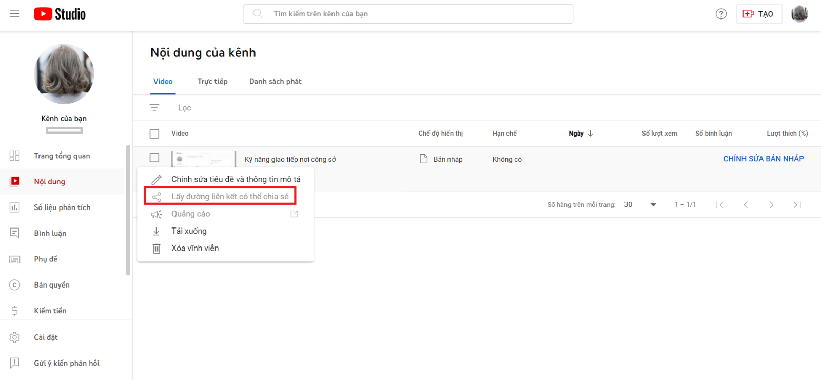 Để lấy đường liên kết của video bạn vào YouTube Studio, vào mục Nội dung. Tại video mà bạn muốn sao chép đường liên kết, bạn bấm vào biểu tượng ba dấu chấm Tùy chọn và chọn Lấy đường liên kết có thể chia sẻ. Sau đó bán vào lại đơn đăng ký Content ID trên YouTube Trợ giúp và dán vào ô cần điền.
