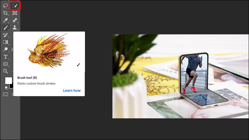 Bước 1: Click chuột vào công cụ Quick Selection Tool → Tiến hành chọn vùng ảnh trên màn hình điện thoại của bạn.