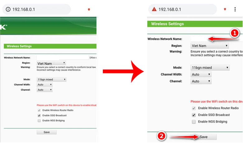 Bước 3: Trong mục Wireless Network Name sẽ là tên WiFi Modem mạng của bạn đang sử dụng. Tiến hành đổi tên ngay tại dòng này > Nhấn Save để hoàn tất quá trình.