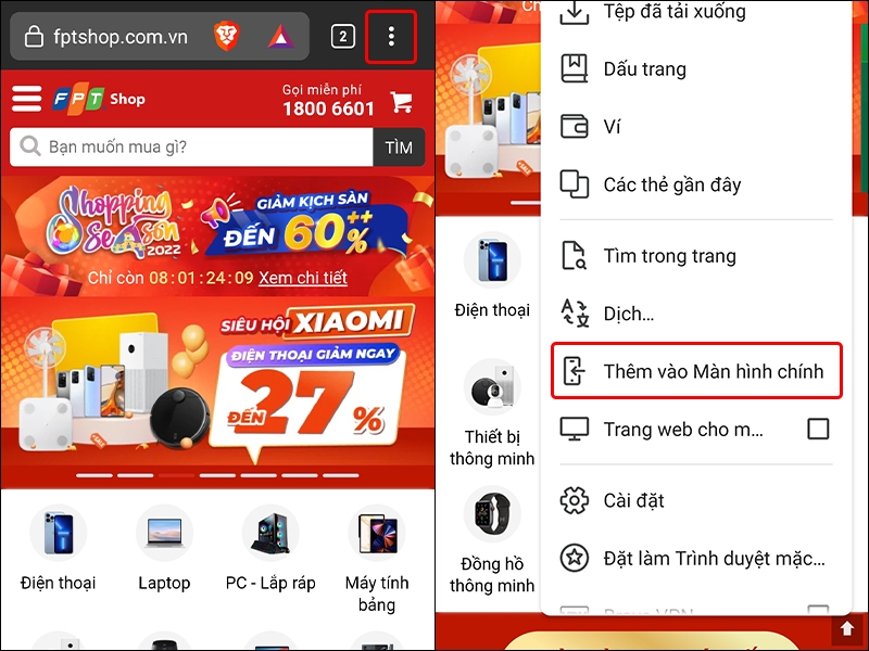 Bước 1: Truy cập vào trang web mà bạn muốn tạo lối tắt trên trình duyệt Brave → Nhấn vào biểu tượng 3 chấm → Chọn Thêm vào Màn hình chính.