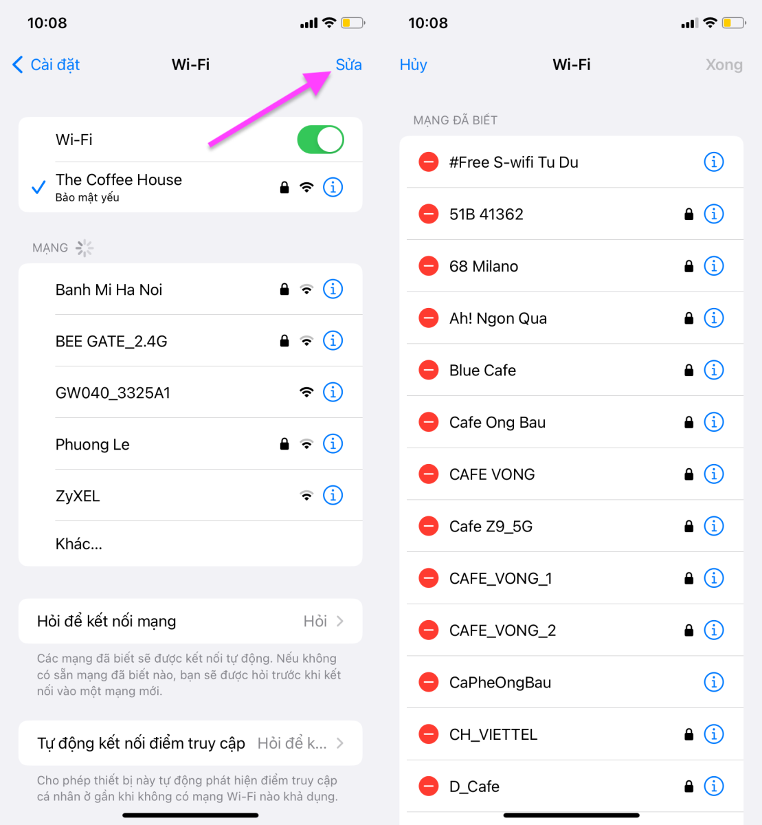 Bước 3: Bấm nút Edit (Sửa) ở góc trên bên phải của màn hình và xác thực bằng Face ID/Touch ID hoặc mật mã. Ngay lập tức, bạn sẽ thấy danh sách tất cả các mạng WiFi mình đã từng kết nối.