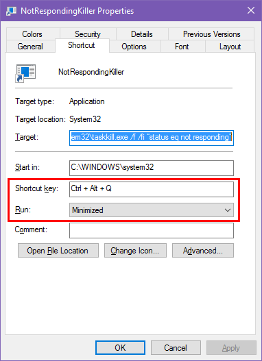 Trong một số trường hợp, bạn có thể dùng một tổ hợp phím được gán sẵn từ trước để thay thế cho con chuột máy tính. Click chuột phải vào shortcut vừa mới tạo, chọn tab Shortcut và nhìn xuống dòng Shortcut key. Bạn có thể dùng Ctrl + Alt + phím bất kì bạn muốn hoặc Ctrl + Shift + phím bất kì bạn muốn. Vì shortcut này sẽ tạm thời gọi lên một cửa sổ Command Prompt nên bạn có thể chỉnh mục Run thành Minimized để khỏi phải nhìn thấy một màn hình nhá lên khi bạn dùng shortcut này.