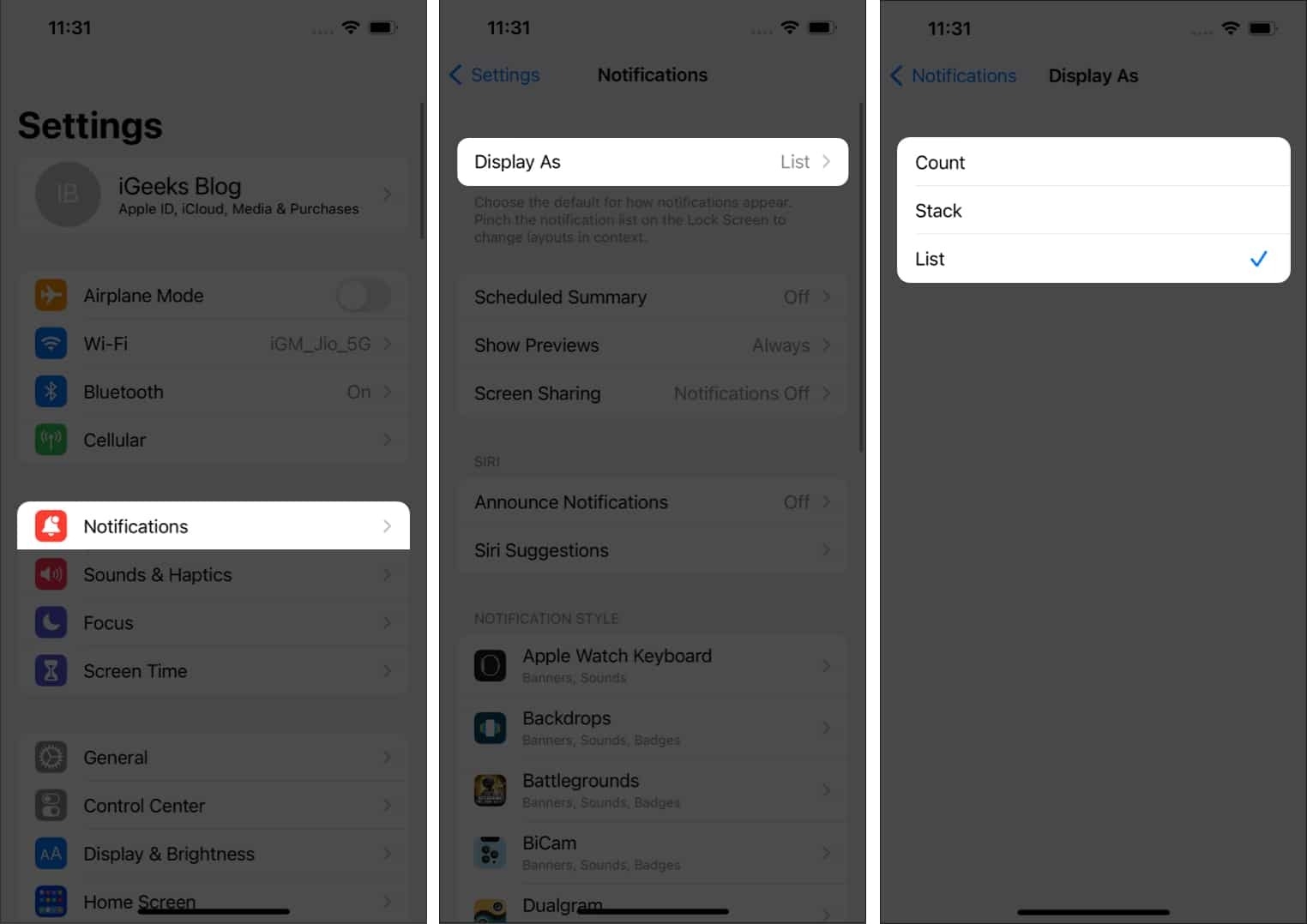 Bước 1: Mở Settings (Cài đặt) > Notifications (Thông báo) > Display As (Hiển thị dưới dạng).