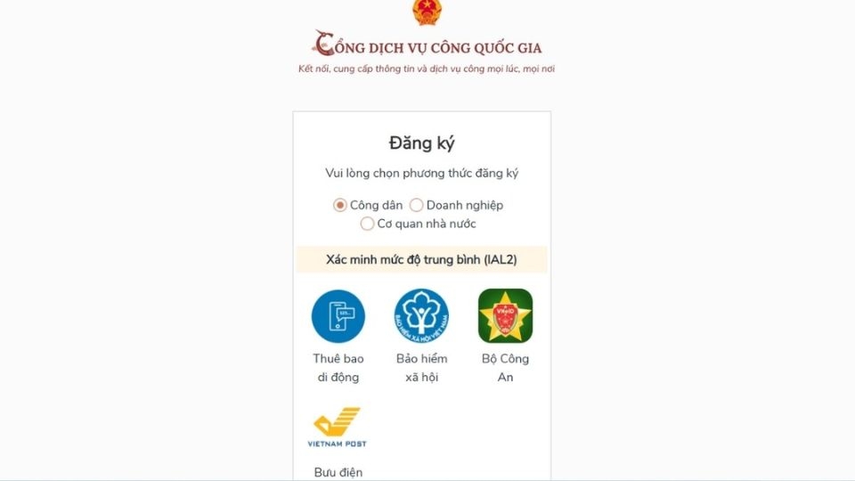 Tại mục Đăng ký > Kích chọn ô Công dân.